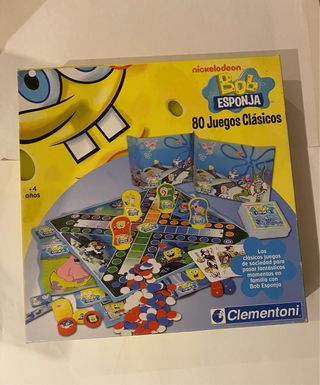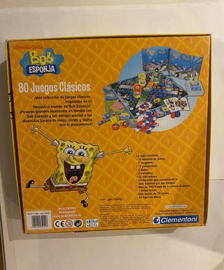 Juego de mesa Bob Esponja 80 Juegos Clásicos de Clementoni. Ideal para los fans de Bob Esponja. - Incluye tablero, fichas y cartas. - Diseñado para niños a partir de 4 años. - Licencia oficial Nickelodeon.