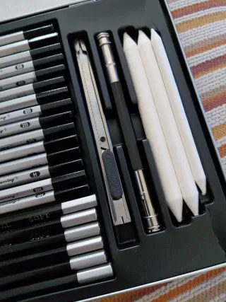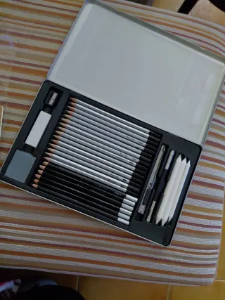 Set de dibujo con lápices de grafito y carboncillo, ideal para artistas y aficionados. Tiene un poco la caja dañada aunque esta a estrenar. - Incluye varios lápices de grafito de diferentes durezas. - Contiene lápices de carboncillo para sombreado. - Incluye accesorios para difuminar y afilar.
