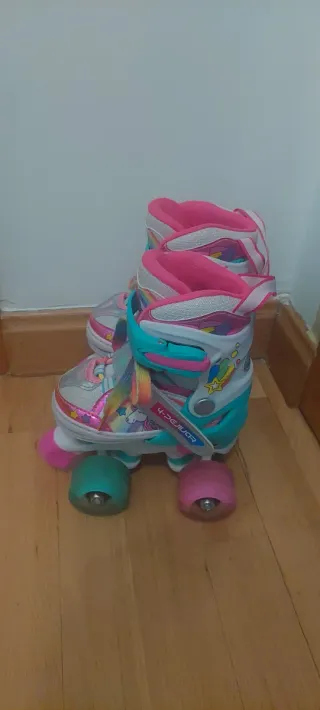Patines con un diseño divertido y colorido, perfectos para los más pequeños. - Diseño con unicornios y estrellas. - Cierre de velcro y hebilla. - Ruedas de colores. - Talla ajustable. - Luces en las ruedas