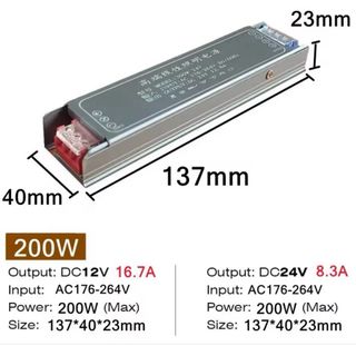 Fuente de alimentación lineal con entrada AC de 175V a 265V y salida DC de 12V, ideal para alimentar luces LED en belenes, dioramas, maquetas, etc Diseñada para ofrecer un rendimiento estable y eficiente. - Potencia: 200W (Máx) - Entrada: AC 176-264V - Salida: DC 12V 16.7A - Dimensiones: 137*40*23mm