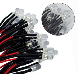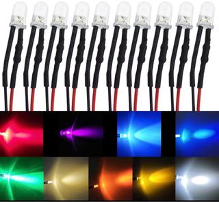 Conjunto de 5 LEDs 5MM, ideales para proyectos de iluminación decorativa en belenes, dioramas, maquetas, etc - Disponibles en color rojo, naranja, verde, azul, amarillo o blanco. - Tamaño: 5mm - Voltaje: 9V y 12V - Funcionan con una alimentación de 9V a 12V