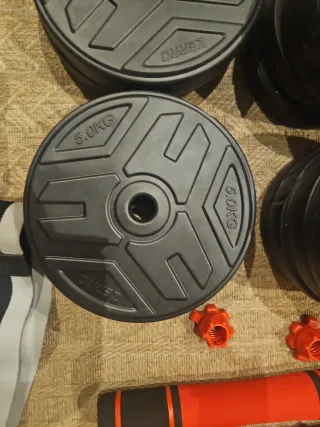 Set de pesas y accesorios para entrenamiento en casa. - Incluye discos de 5kg. - Barra divisible con mangos de goma. - Mancuerna. - Banda de resistencia.