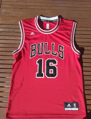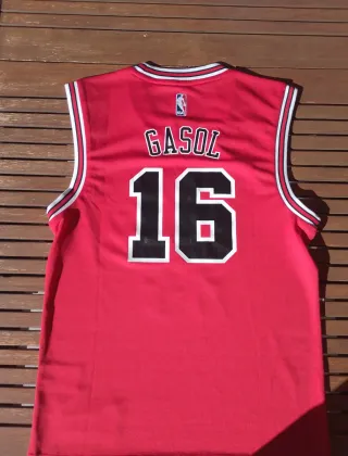 Camiseta de baloncesto de los Chicago Bulls, número 16, de Pau Gasol. Diseño clásico en color rojo. - Marca Adidas. - Logo de la NBA.