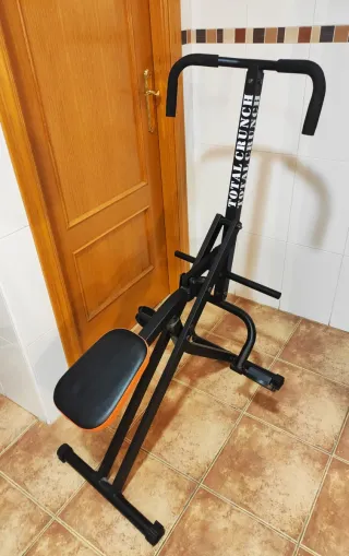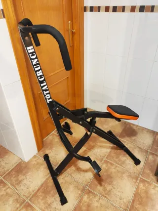 Máquina de ejercicio multifuncional Total Crunch. - Estructura de metal negro. - Asiento con detalle naranja. - Empuñaduras acolchadas.