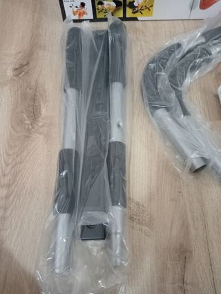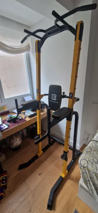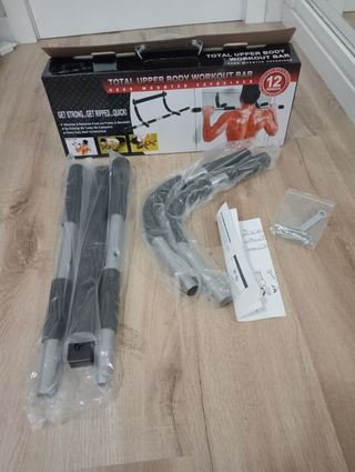 Barra de dominadas prácticamente nueva para pull ups y dips. Tiene una estructura muy sólida con buenos acabados y materiales. Se ha utilizado un par de veces, no tiene desgaste ni imperfecciones y se vende en su caja original con todos los plásticos protectores