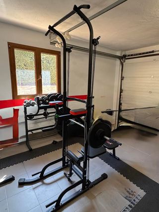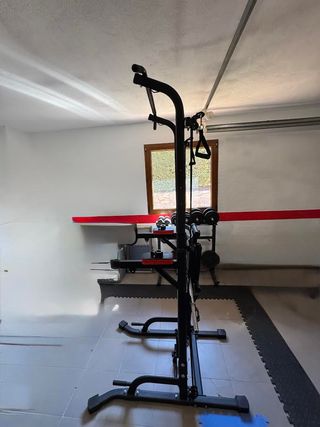 Rack de entrenamiento Decathlon modelo 500 tengo barras y discos ademas, en perfecto estado mas los dips para hacer fondos press banca peso muerto y dominadas perfecto para entrenar en casa - Estructura metálica robusta. - Barras de soporte ajustables. - Base estable con soportes para discos.
