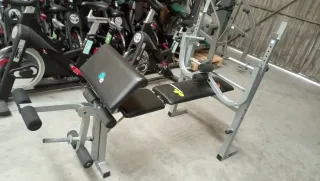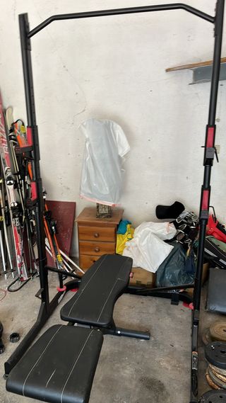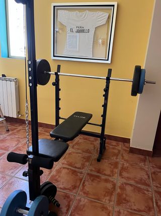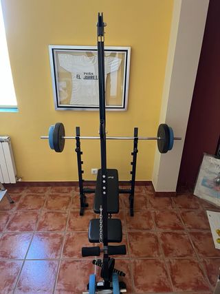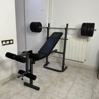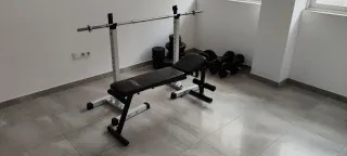 Equipo de gimnasio completo para entrenar en casa. - Banco ajustable en varias alturas - Juego de discos de pesas. - Barra de pesas.