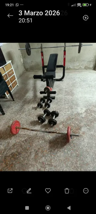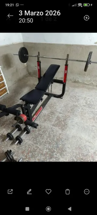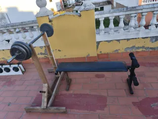 Equipo completo para entrenar en casa. - Banco de gimnasio con soportes para pesas. - Barra de pesas. - Juego de discos de pesas de diferentes tamaños y pesos. - Esterillas protectoras para el suelo. - tengo también pelotas de pilates y cosas varias que no están en las fotos si las quieren. Quiero quitarme esto de casa
