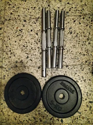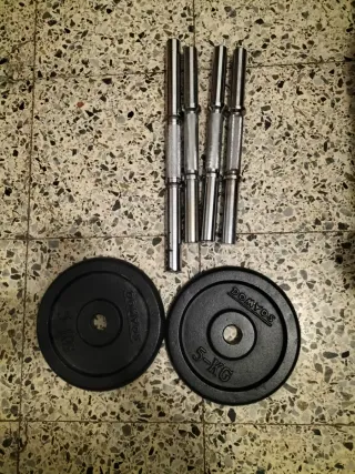 Kit de mancuernas y discos de pesas para entrenamiento en casa. - Dos barras de mancuerna. - Cuatro cierres de estrella. - Tres discos de 5 kg. - Cuatro discos de 2 kg. - Cuatro discos de 1 kg.