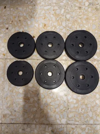 Discos de pesas de 2.5kg cada uno, diseñados para barras de 30mm. - Dispongo de 6 unidades. Si compras 1 unidad: 8,50€ 2 unidades: 16€ 3 unidades: 22,50€ 4 unidades: 28€ 5 unidades: 32€ 6 unidades: 37€ - Peso: 2.5 kg por disco. - Diámetro interior: 30 mm. - Diámetro exterior: 20 cm - Material: Goma y goma