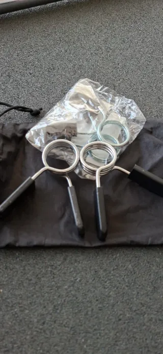 Conjunto de cuatro pinzas para barra de pesas de 30mm. Incluye una bolsa de tela negra para guardarlas. - Material: Metal y plástico. - Cantidad: 4 unidades.