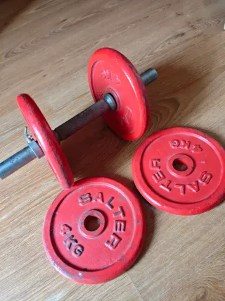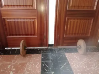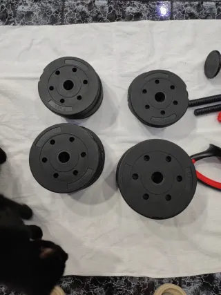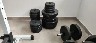 Set completo de pesas para entrenar en casa. Super poco uso. - Incluye discos de diferentes pesos (1'25kg a 2'5kg) - Barras para mancuernas. - Barra para hacer pecho. - Agarre acolchado para mayor comodidad. - Cierres de seguridad para los discos.
