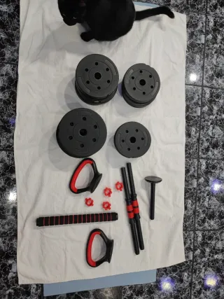 Conjunto de pesas para entrenamiento en casa. Incluye una mancuerna ajustable y varios discos. - 2 barras con cierre. - Discos de diferentes pesos: 5kg, 2.5kg, 1.25kg y 0.75kg. Hay 4 de cada. - 2 Mancuernas azules de 4kg.
