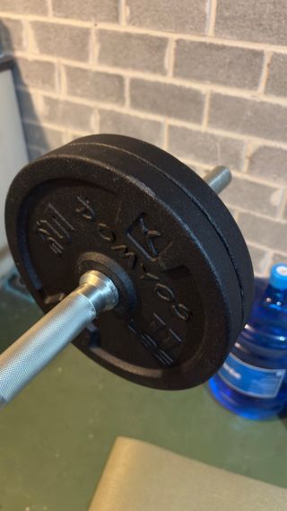 Barra Z con cierres de rosca y discos de distintos pesos El peso total del conjunto sumando barra y discos es 20 kilos Perfecto para entrenar en casa Pesas mancuernas 20kg kilos gimnasio calistenia fuerza hipertrofia musculo gim entrenamiento culturismo deporte musculacion domyos decathlon salter fitness crossfit