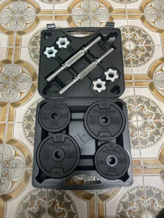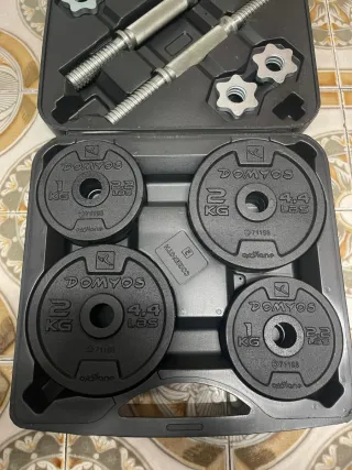 Vendo kit original de mancuernas Domyos de 20 kg de Decathlon, en muy buen estado y muy poco uso. Incluye: • 2 barras roscadas • Discos de diferentes pesos hasta un total de 20 kg • Cierres de seguridad • Maletín original para guardarlo todo cómodamente Ideal para entrenamiento en casa: fuerza, tonificación y rutinas completas. Material robusto, fácil de montar y desmontar, y ocupa poco espacio gracias al maletín.