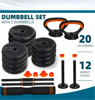 Kit de mancuernas para entrenamiento de fuerza. - Incluye barras, discos y cierres. - Peso total del kit: 20 kg. - Ideal para ejercicios de bodybuilding.