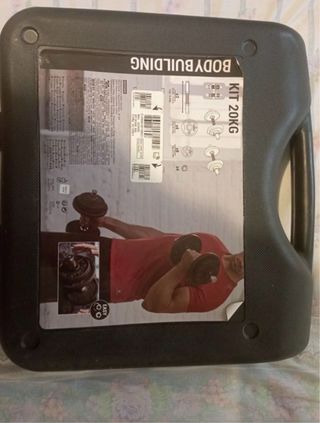 Precio no negociable Kit de pesas de 20 kg (44 lb) con maletín. - Incluye barras y discos. - Maletín de transporte. - Marca Decathlon. Usado 5 veces contadas Precio Nuevo 50€