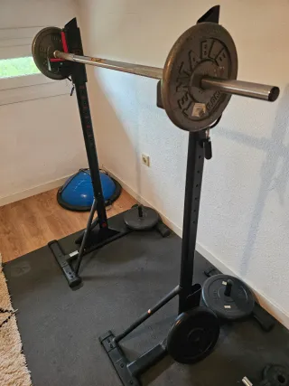 Rack de pesas con barra y discos para entrenamiento en casa. - Estructura metálica negra. - Barra de pesas incluida. - Discos de pesas de diferentes pesos.(2x5kg, 4x10kg) También se vende suelto. Rack 50€ Barra 25€ Discos 5kg 10€(unidad) Discos 10 kg goma 20€(unidad)