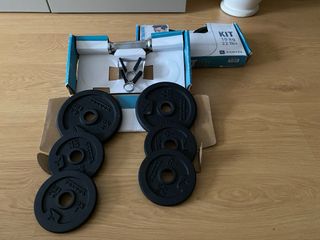 Juego de pesas para hacer ejercicio en casa decathlon - 4 barras de 35cm - 10€/unidad- 32€/pack - 12 Discos 1kg - 2€/unidad - 22€/pack - 10 discos 2kg - 4€/unidad - 35€/pack