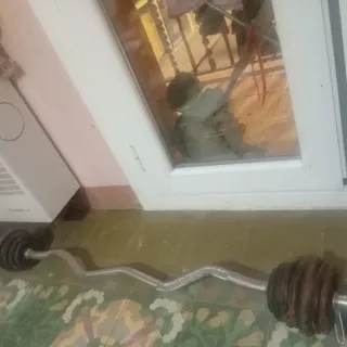 Conjunto de equipamiento para entrenamiento en casa. Barra 120cm 8kg 28mm con cierres 18€ Barra salter de mancuerna de 2kg con cierres 7€ Dos discos salter de 1kg 5€ 30mm - Dos mancuernas 10kg 40€ Pesa rusa 10kg 20€ 2 pesas rusas 6kg cada una a 30€ las dos Dos discos de 5kg cada uno de 28mm 22€