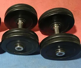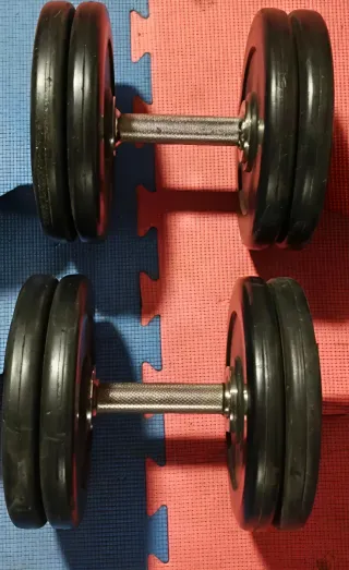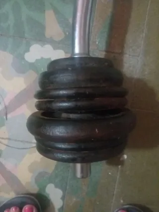 Conjunto de equipamiento para entrenamiento en casa. - Mancuernas hexagonales de goma. - Mancuernas redondas. - Discos de pesas. - Barra de pesas. Todo completo 650€ Por separado -5kg. 25€ -7,5----35€ -10-----45€ -12,5----60€ -15------65€ -17,5----70€ -20-----75€ -22,5---75€ -25-----80€ Disco de 5kg----30€ el juego Discos de 10kg--50€ el juego Barra de 30kg ---60€
