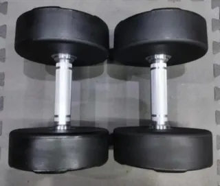 Par de mancuernas de 22 kg cada una, son de metal cubierto de goma. Palabras clave: Discos, powerlifting, pesas, banco, barra, mancuerna, fit, bodybulding, fitness, crossfit, dechatlon, multifuncion, máquina, polea, jalón, fitness, bodypump, musculacion, ejercicio físico, oportunidad, oferta, Domyos, Salter.