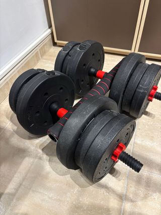 Juego de mancuernas ajustables con un peso máximo de 15kg cada una. Ideales para entrenar en casa. - Discos de peso negros. - Mangos con agarre antideslizante. - Cierres de seguridad rojos. - Barra para unir mancuernas