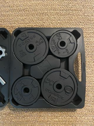 Set de pesas ajustables con un peso total de 19kg. Se encuentran en perfecto estado. - Incluye barras y discos. - Cierres de seguridad incluidos.