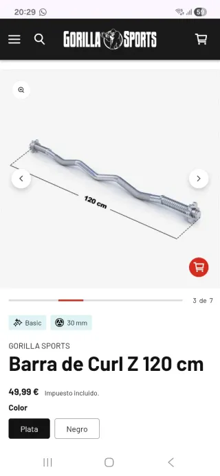 Barra Z Curl cromada, con topes de rosca. Incluye los dos topes de rosca para asegurar los discos. Medidas: - Largo: 120 cm - Ancho: 30/31 mm - Longitud zona de carga por lado: 18 cm - Ancho interior agarre: 80 cm Material: Acero cromado Carga max.: 180 kg Peso: 8 kg (500 g aprox. los topes) Adjunto pantallazo del mismo modelo para comprar por internet. ¡Precio negociable!