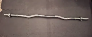 Barra de pesas curva EZ de acero, ideal para ejercicios de bíceps y tríceps. Incluye dos discos. - Longitud de 120 cm. - Fabricada en acero. - Diseño curvo para un agarre ergonómico.