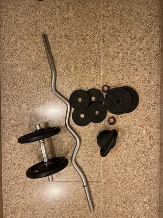 Vendo set de pesas muy completo para entrenamiento en casa, prácticamente nuevo, nunca utilizado. 👉🏼 Importante: lo vedo completo, no piezas por separado. Solo en discos son 77,5 kg de peso, más las barras. Incluye: - 2 discos de 15 kg - 2 discos de 10 kg - 2 discos de 5 kg - 4 discos de 2,5 kg - 6 discos de 1,25 kg - 1 barra larga recta de metal - 1 barra curva EZ de metal - 2 barras cortas de mancuerna - Barra conectora acolchada + cierres Valor nuevo de 280€. Ideal para montar tu propio gimnasio en casa. 📍 Se entrega en Calle Sant Antoni Maria Claret con Calle Navas de Tolosa o Calle Biscaia.
