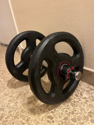 Par de mancuernas ajustables con discos de peso. - Discos de peso negros. - Barra con agarre texturizado. - Cierres de rosca para asegurar los discos.