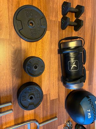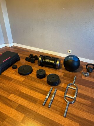 Conjunto de equipamiento para entrenamiento de fuerza en casa. - Barra de pesas. - Mancuernas. - Discos de pesas. - Balón medicinal de 7 kg. - Kettlebell. - Step de entrenamiento