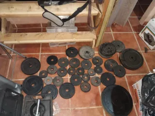 Equipo de gimnasio para entrenar en casa. - Rack metálico. - Banco abdominal. - Barra. - Discos de pesas. 4 discos de 10kg 8 discos de 5kg 8 discos de 2,5 kg 4 discos de 0,50 kg La barra es desmontable y pesa 7'5 kg y las pequeñas también son desmontables a rosca, son de un kit de decathlon de 50kg pero compré más discos y en total habrán unos 90 kg con todos los discos