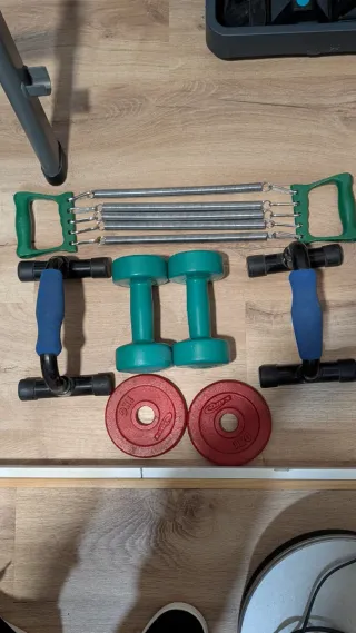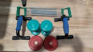Conjunto de equipo para ejercitarse en casa. - Dos mancuernas verdes. - Dos barras para flexiones con agarre azul. - Un expansor de resortes con mangos verdes. - Dos discos de pesas rojos de 1kg cada uno.