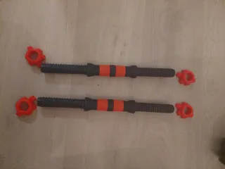 Kit de mancuernas ajustables con discos de peso para entrenar en casa. Incluye barras, discos y cierres. - Barras con agarre texturizado. - Discos de peso de diferentes tamaños. - Cierres de seguridad para fijar los discos.