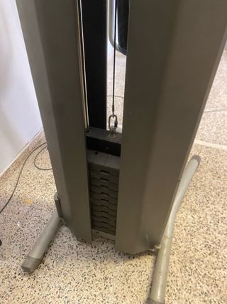 Máquina de ejercicios para el hogar con sistema de poleas y pesas. - Incluye barra de tracción superior. - Asiento acolchado. - Empuñaduras para ejercicios. - Torre de pesas integrada.