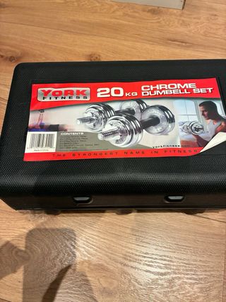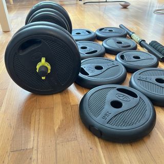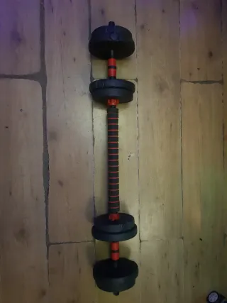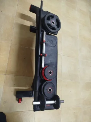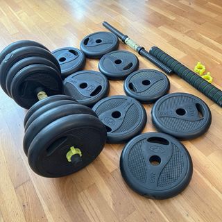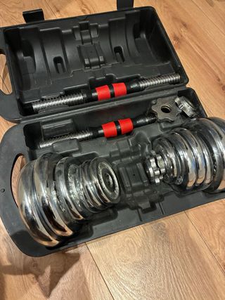 Conjunto de pesas y mancuernas ajustables. Permite configurar el peso hasta un máximo de 40kg. - Incluye barra de mancuerna con agarre acolchado. - Discos de peso de diferentes tamaños. - Sistema de cierre seguro para los discos. Juego completo. En perfecto estado.