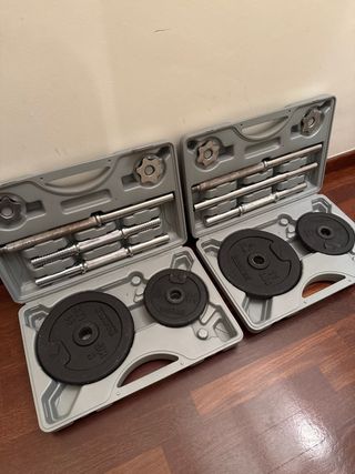 Set de pesas para entrenamiento en casa. - Dos mancuernas de 20 kg cada una. - Una barra de 50 kg.