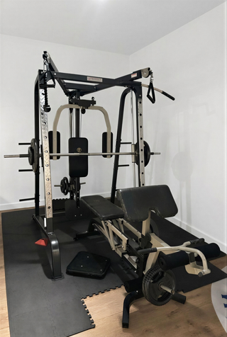 Equipo de gimnasio completo para entrenar en casa. Se vende por cambio de domicilio. El rack y el banco están nuevos. Pack: - Rack de musculación. - Banco de press. - Barra, dos mancuernas y bloqueadores. - Discos de pesas. 46 kg El verano ya está aquí!