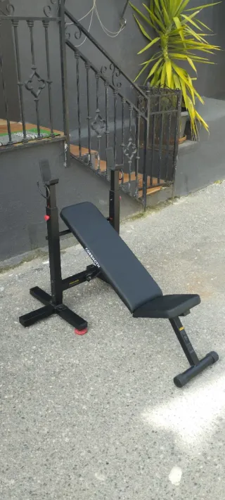 banco de musculación Bench 500 + un kit de mantenimiento de 50 kg (Décathlon). Banco multiposición plegable. Trabaja la parte superior del cuerpo, sobre todo con el desarrollo tumbado (en horizontal o inclinado) gracias a las 3 inclinaciones del banco, y los abdominales. peso máx. usuario: 110 kg // Carga máx. (barra + discos): 110 kg. 1 posición abdominales + 1 posición banco plano + 2 posiciones inclinadas. respaldo rígido e inclinable con 2 posiciones (30 y 80 grados). Espuma cómoda. 4 discos de 5Kg 8 discos de 2Kg 4 discos de 0.5Kg 1 barra de 155 cm 2 barras de 35 cm Recogida en Granada.