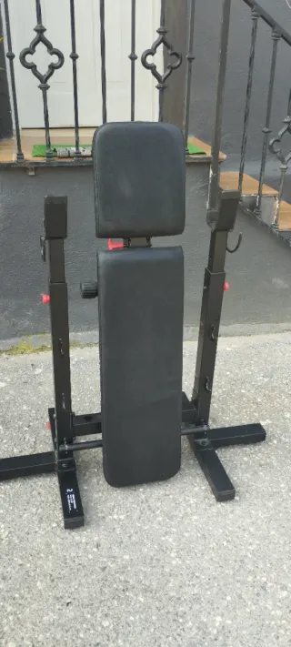 Equipo de gimnasio completo para entrenar en casa. Rack de musculación resistente. Barra incluida. Banco inclinable. Discos de pesas de: - 2x20kg - 4x5kg - 4x2kg - 8x1kg Barras de mancuernas incluidas. Accesorio para fondos de tríceps incluido. Regalo suelo