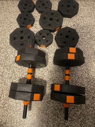 Set de pesas ajustables para entrenamiento en casa o gimnasio. Incluye discos y barras para personalizar el peso. - Discos de peso. - Barras para pesas. - Diseño octogonal de los discos.