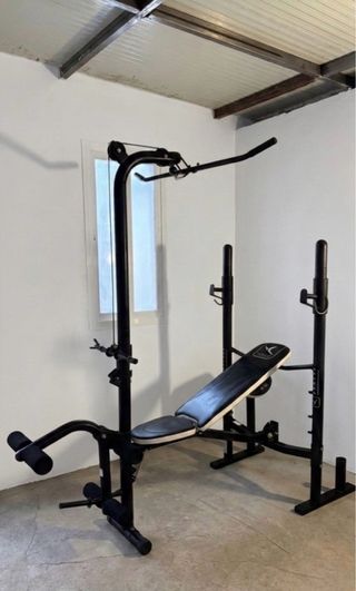 Banco de press banca multiusos, pecho, espalda, piernas, de la marca Domyos, Decathlon, ideal para entrenar en casa. ✅ Incluye polea con barra. ✅ Incluye asiento para hacer biceps. ✅Incluye cierres de seguridad para que no se caigan las pesas de la polea. ✅ Lleva sin usarse mucho tiempo, pero se encuentra en muy buen estado. Mejor ver y probar ❌ No hago envíos. Aún conserva las pegatinas de peso máximo y diseño. Preguntar sin compromiso.
