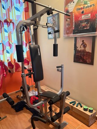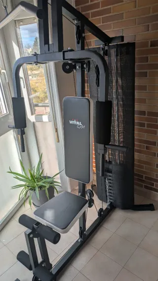 Multiestacion de entranamiento Vitalgym k6000 de 60Kg, 178x108x210 altura El aparato tiene justo un año. Poco uso. Lo vendo por mudanza. Nuevo costó 299€. Está montada, la puedo desmontar y te la llevas o vienes y la desmontamos. Tengo también el manual de montaje. Por razones de peso no envío. Abstenerse ofertas absurdas. - Diseño compacto. - Tapicería acolchada en asiento y respaldo. - Barra de pesas integrada. - Poleas y cables para diversos ejercicios.
