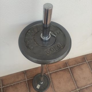 Mancuerna de la marca Salter. Ideal para entrenamientos en casa. Tiene un poco de oxido de estar al aire libre pero se puede quitar y lijar. Disco pesa de cuatro kilos más la barra