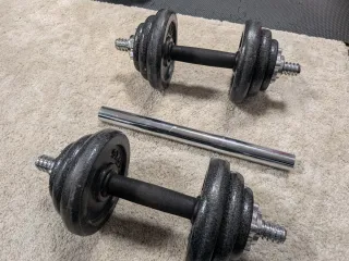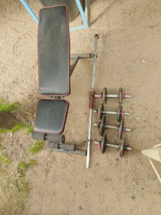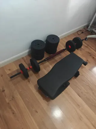 Vendo equipo completo de gimnasio en casa por falta de espacio. Está en perfecto estado y es muy versátil para entrenar todos los grupos musculares. ¿Qué incluye el pack? Banco de pesas ajustable: Multiposición (plano e inclinado) para diferentes ejercicios de press. Es plegable, por lo que se guarda debajo de la cama o en un rincón sin ocupar nada cuando no se usa. Set de pesas versátil: Hasta 24 kilos por mancuerna. Mancuernas 2 en 1: Los dos mangos de mancuerna se pueden unir mediante una barra acolchada central para convertir el set en una barra larga de pesas, ideal para sentadillas o peso muerto