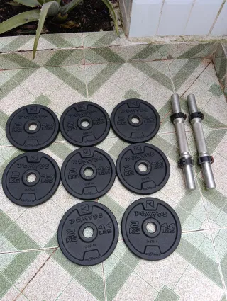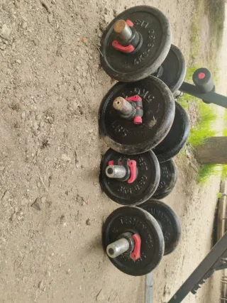 Se vende conjunto de diez pesas de disco (4x1,25kg + 4x2,5kg + 2x5kg), junto a dos barras de mancuerna, barra extensible de mancuernas, barra de 1,60 cm, y banca reclinable. Todo en perfecto estado, con muy poco uso.