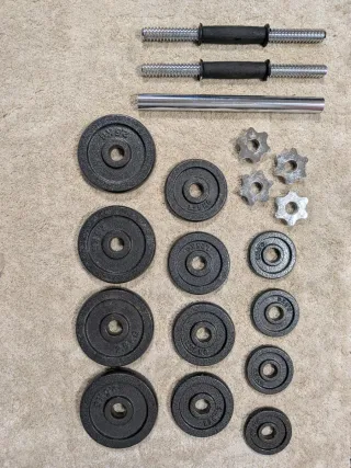 Juego de pesas de 30 kg en perfecto estado. Incluye: - 4 placas de 0.5kg - 4 placas de 1.25kg - 8 placas de 2.5kg - 2 barras de 35cm - 2 barras con cierre de rosca - 1 barra de unión - 4 cierres