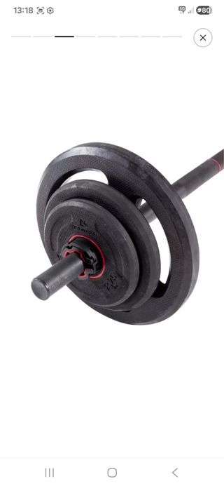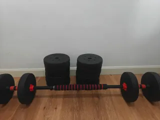Set de mancuernas ajustables de la marca DOMYOS de 20 KG. - Incluye 4 discos adicionales de 5 kg (11 lbs) cada uno. - Dos barras de mancuerna con cierre de seguridad. - Diseño con agarre texturizado para mayor firmeza. El kit nuevo + las 4 pesas sale por 100 euros
